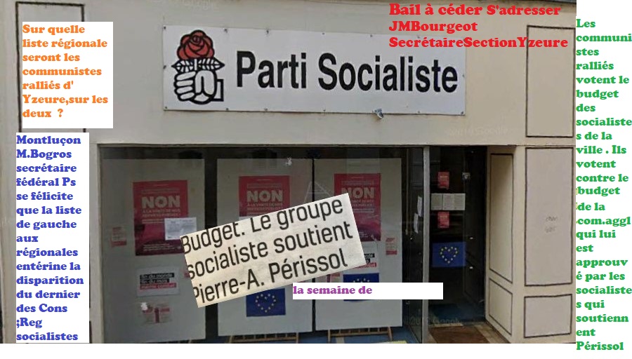 Il est assez symbolique de constater que le jour même où la fédération du PS publiait sa liste de candidats ,il annonçait qu' il renoncerait au siège de Moulins .Plus personne ne veut l'entretenir et le faire vivre ,y recevoir des gens en difficultés ,le faire connaitre . On pourrait y mettre un peu de lumière et le faire vivre mais comme à Yzeure on éteint l'éclairage . Faut-il rappeler qu'il y a eu un temps que les quelques soixantenaires du conseil fédéral ne peuvent pas connaitre un militant socialiste avait acheté un ensemble canapé fauteuils tables chaises pour que les militants puissent venir discuter .Il faudra sans doute demander l'accord à l'ancien propriétaire .