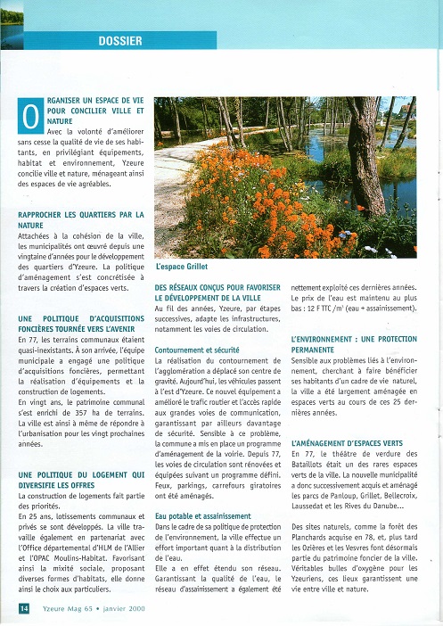 Yzeure en 2000 était devenue un véritable espace de vie grâce à une politique environnementale liée à une urbanisation harmonieuse suite à une forte acquisition foncière (357 hectares de terrains en 20 ans). Le dossier de janvier 2000 retrace l’évolution de la ville initiée par les équipes municipales successives et les associations. Jean Paul Desgranges maire de 1977 à 1989 décline à travers les colonnes de ce numéro qui lui sont ouvertes les réalisations importantes. En complément des acquisitions foncières telles la zone de millepertuis, le parc Laussedat, le volet économique (implantations de la MACIF, du centre de distribution Leclerc et création de la zone artisanale du parc de la Mothe) s’est fortement développé. Le foyer des Bataillots, la gendarmerie, la Gloriette ouverte en 1991, Yzeurespace, la salle de sports de Bellevue ont au fil des ans complété les équipements de la ville jusqu’à ce jour. En se souvenant des belles choses tout en n’oubliant pas les échecs, l’homme politique responsable qu’il est, souligne son regret de n’avoir pu malgré trois ans de lutte, s’opposer à la fermeture de l’usine Thomson. Enfin son regard sur l’avenir est particulièrement positif car il apprécie l’effort social qui se poursuit ainsi que les réalisations audacieuses comme le plan d’eau des Ozières et se dit particulièrement sensible à la politique relationnelle ouverte et au souci d’une gestion démocratique de la ville.