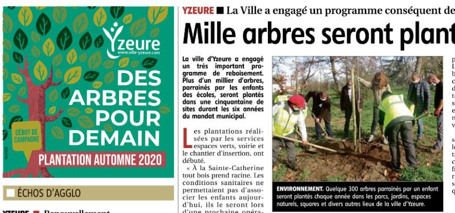 Et voilà Mme Planche n'ayant sans doute pas été convaincante, c'est le moins qu'on puisse dire, le groupe des élus majoritaires comme ils se désignent, il faut bien s'en convaincre, font appel à l'Adjointe à l'événementiel qui est obligée de sortir le grand jeu et puiser dans ses fonds sans doute. Un pavé publicitaire, très certainement payant est positionné à coté de l'article. Quelle perte d'influence de la ville d'Yzeure !  Une petite moitié de page pour 1000 arbres à Yzeure, 2 pages pour 300 arbres à Moulins ! Grillée aussi sur le calendrier ? Tout ça pour un message subliminal :  "Les arbres se plantent à l'automne". Combien coûte cette plaisanterie ?