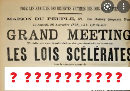 À la fin du XIXe siècle, la France connaît une période troublée qui fait frémir le pouvoir : les anarchistes s’attaquent aux symboles de la bourgeoisie, les attentats se multiplient, allant jusqu’à l’assassinat du président Sadi Carnot en 1894. La condamnation est unanime, l’opinion publique a peur. La république répond par trois lois entre 1893 et 1894. La troisième s’attaque aux délits de presse, porte atteinte à la liberté d’expression et n’a été abrogée qu’en 1992, soit un siècle de bons et loyaux services. Ces lois sont restées dans l’histoire sous l’appellation que leur a donné Jean Jaurès de « lois scélérates ».
