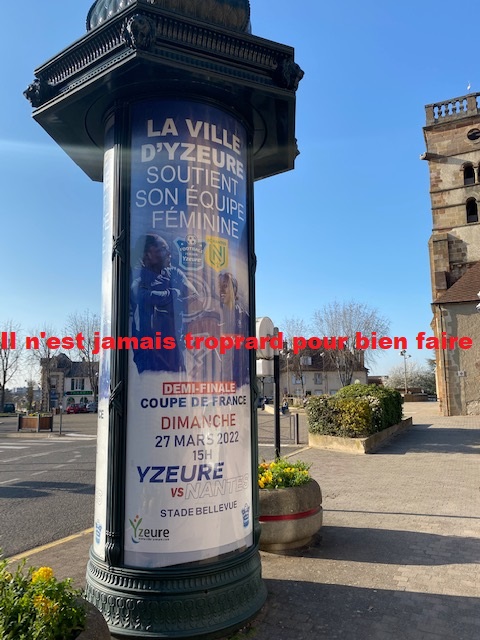 Sur la place du marché ,on disait que ,mais ce ne sont que des propos de marché ,que les conseillères municipales majoritaires d' Yzeure prises de remords se presseraient dans les tribunes de Bellevue avec des pancartes "oui à l'égalité hommes femmes "pour faire acte de contrition ou d' attrition "pour ne pas avoir voté pour une augmentation de la subvention .