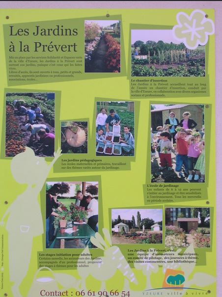 Depuis 2004, diverses actions autour du jardinage se sont mises en place à destination de tous les publics : école de jardinage, projets pédagogiques menés par les écoles, stages pour les adultes, fête des jardins etc. pour que chacun apprenne de l’autre. Le contenu de la réalisation Les jardins à la Prévert, lieu d’entraide à vocation sociale où chacun prend en considération les idées de l’autre, reposent sur l’idée de solidarité et de diversité. Ils sont faits par tous, et pour tous.