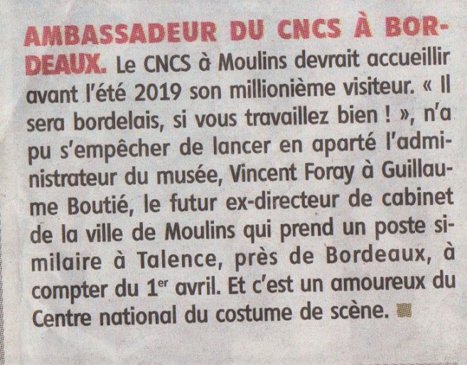 Mais le quotidien local est là. Pour l'avenir il nomme G. Boutié directeur de Cabinet du Maire de Moulins, Ambassadeur du CNCS, rappelons que ce musée est financé par l'Etat. Un article de presse serait d'ailleurs intéressant pour connaitre le montant des participations des différents partenaires au financement du fonctionnement du CNCS. Ce sera un sujet de débat pour les prochaines Elections Municipales.