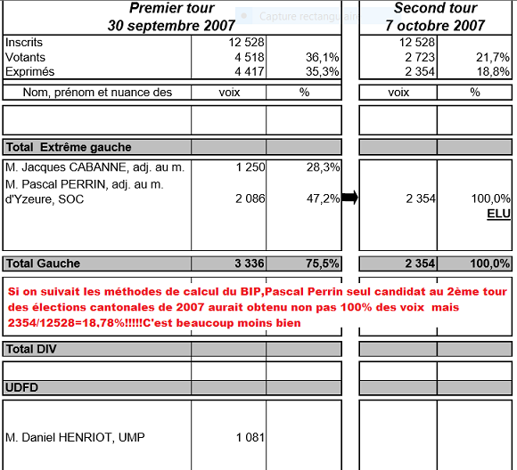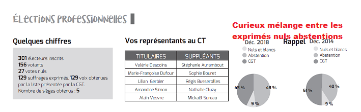 Si le Figaro avait présenté les résultats comme sur le BIP la liste conduite par Pascal Perrin aurait obtenu 2659 / 9623 = 27,63 % au lieu de 42,61 % ce n'est pas la même chose. Il ne peut pas s'agir d'une erreur. La comparaison sur les mêmes bases avec 2014 n'est pas sans arrières pensées. Il est vrai que dans un autre article sur lequel nous reviendrons d'ailleurs car il est étonnant, il est indiqué que les agents n'ont pas le droit de critiquer hiérarchie et élus  sur les réseaux sociaux. Pourtant là ce serait justifié. Vous devriez savoir Mesdames, Messieurs que le pourcentage de voix pour être élu se calcule en fonction des suffrages exprimés. Et si ce n'était pas une erreur ? Un rectificatif devra être fait dans le prochain BIP.