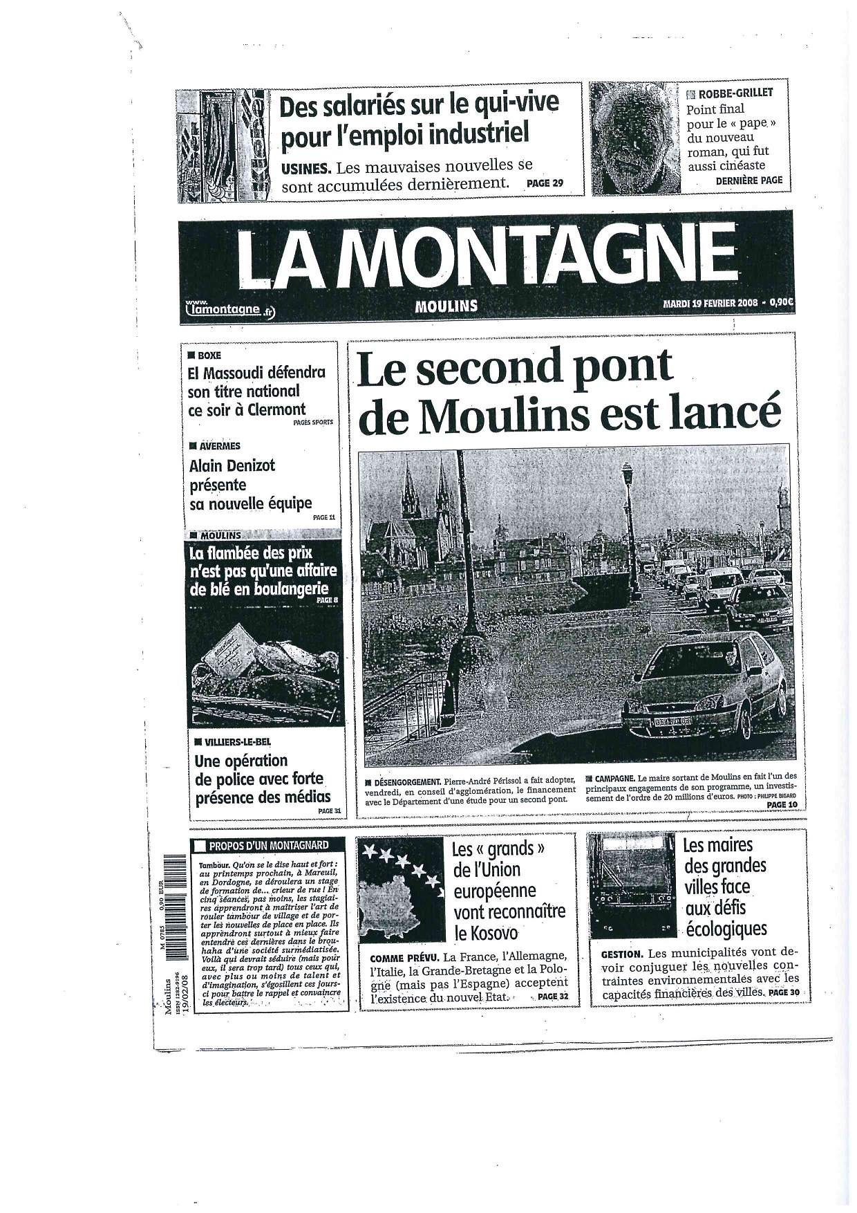 Nous pensions vous présenter en avant première la première page du journal La Montagne du 11 février 2019 qui annonçait : "le second pont est lancé". En effet, à un peu plus d'un an des élections municipales de 2020, notre quotidien local toujours prêt à relayer les informations de la majorité municipale se devait d'annoncer une telle nouvelle.