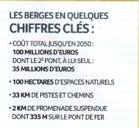 Et maintenant venons-en aux chiffres ! 100 millions de coût total - 35 millions pour le pont, il reste 65 millions de prévus pour 100 ha d'espaces naturels, 33 km de pistes et chemins, 2 km de promenades suspendues (le terme choisit nous oblige à imaginer les solutions que l'on va nous proposer pour traverser la rivière peut-être accroché à un fil !).