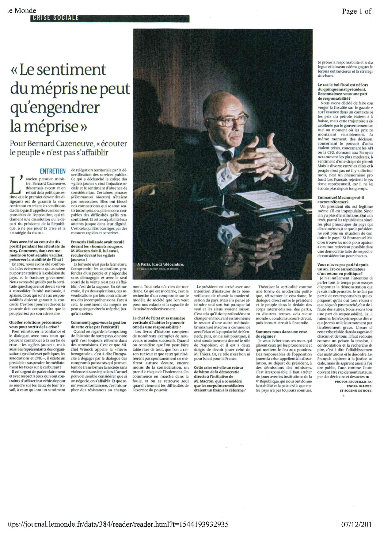 06 Déc 2018 Du B au C :Bernard Cazeneuve : Interview dans le Monde du 5 décembre....pour tous ceux qui ont quelques pouvoirs ou qui croient en avoir...... "Le sentiment du mépris ne peut qu'engendrer la méprise". Pour Bernard Cazeneuve" écouter le peuple n'est pas s'affaiblir (le Monde du 5 décembre 2018).