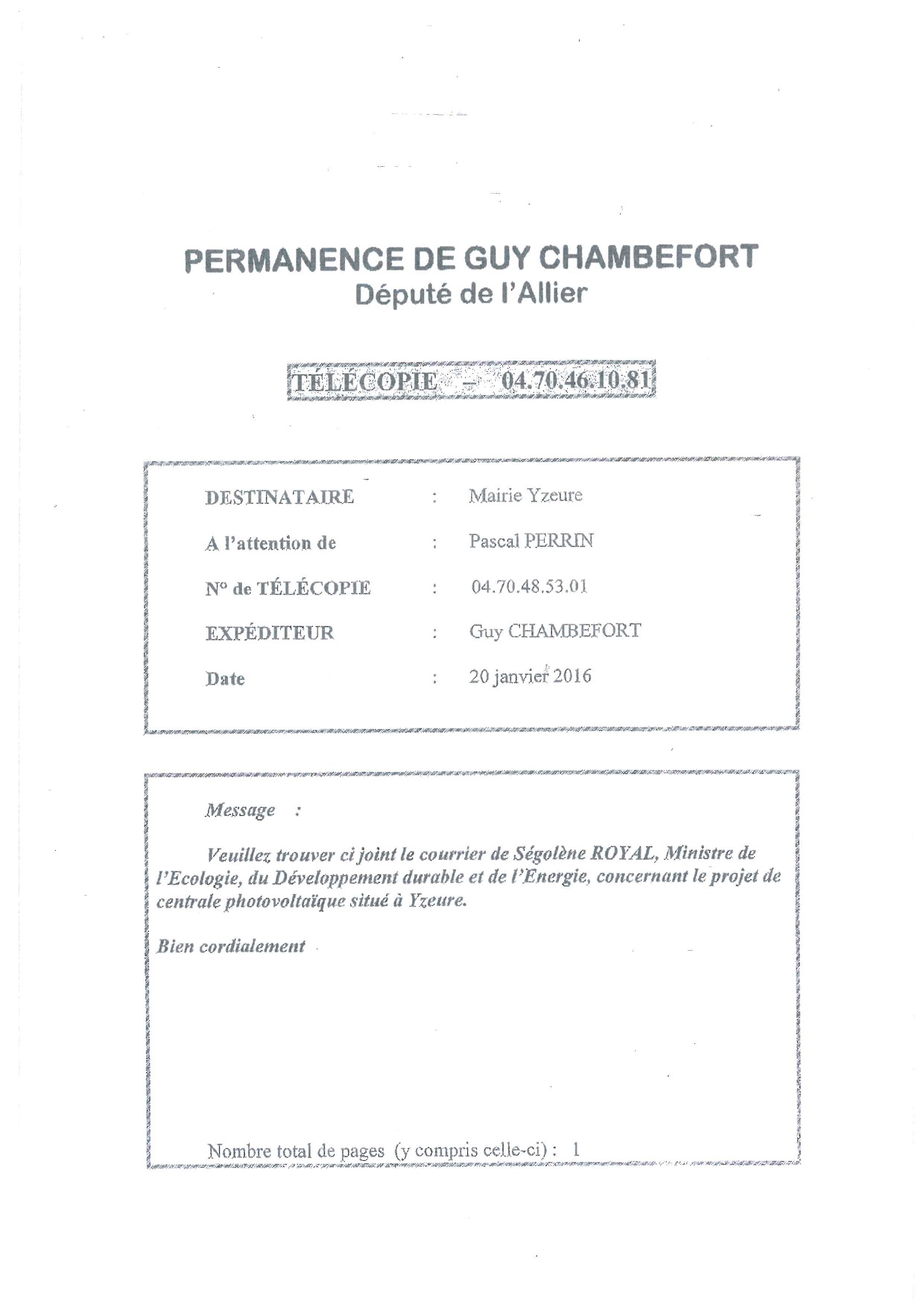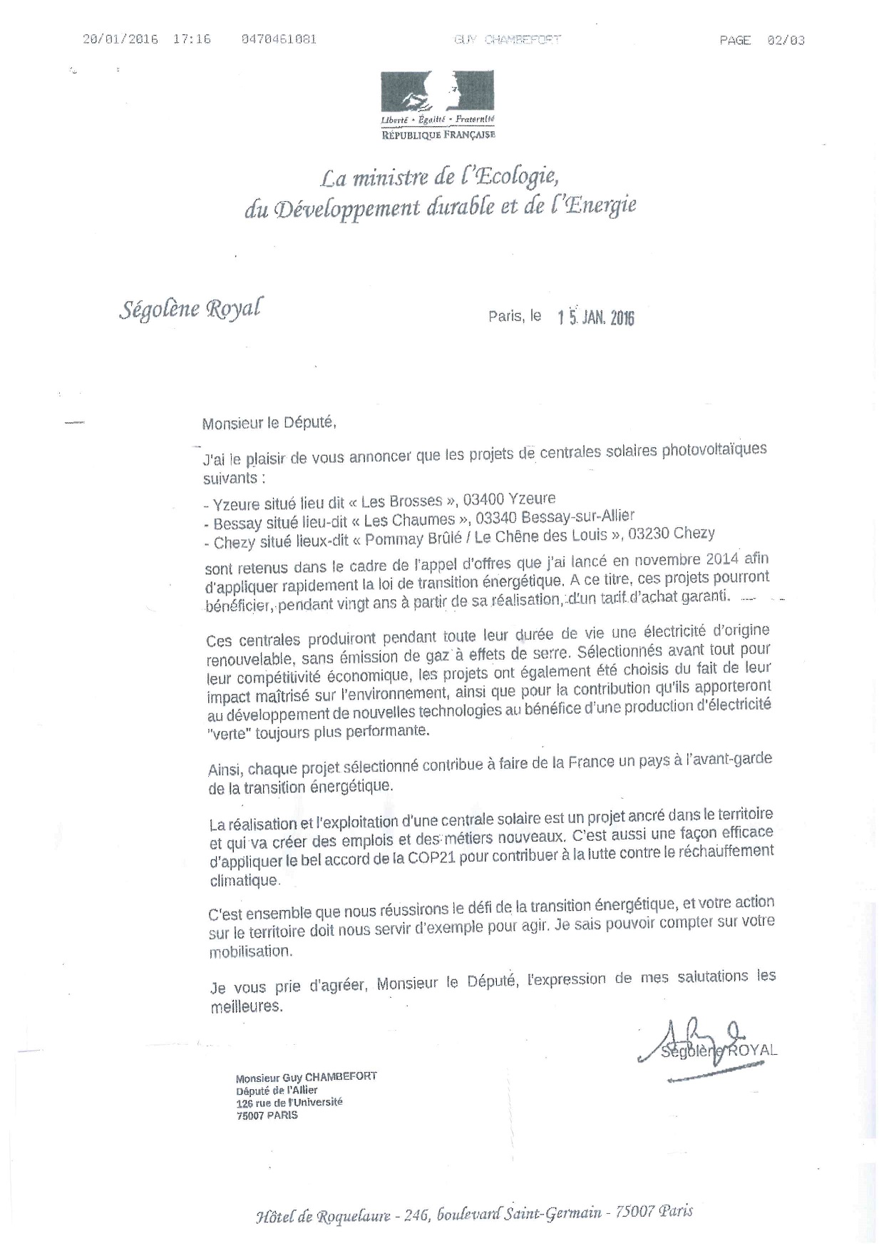Le Conseil municipal en mai 2015 confirme simultanément la promesse de bail emphytéotique à Photosol en vue de de la construction de la centrale photovoltaïque. Mais il restait à obtenir l'accord de la Ministre de l'écologie et du Développement durable et de l'Energie Ségolène Royal. J’ai effectué comme député, de nombreuses démarches pour que trois projets (Yzeure Bessay Chézy : voir courrier) soient inclus dans l'appel d’offres lancé en novembre 2014 par la ministre afin d'appliquer rapidement la loi de transition énergétique. Il faut rappeler que la précédente ministre n'avait pas retenu notre territoire pour ce type d'implantation. Malgré un avis défavorable assez inexplicable du Commissaire enquêteur, le Préfet accordait après de nouvelles démarches nationales et locales le permis de construire. La centrale a été construite entre août 2017 et février 2018 où elle a été raccordée au réseau. Elle a été inaugurée le 24 septembre en présence du Maire d'Yzeure (pièces jointes : le courrier de Ségolène Royal au Député)