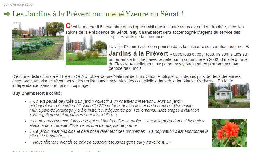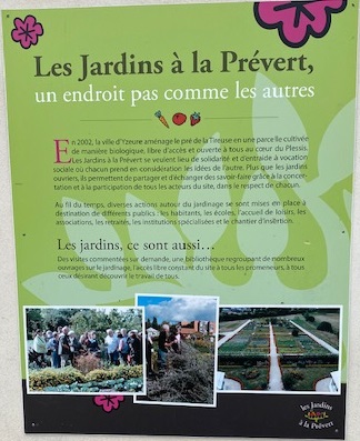 Ces jardins  étaient une des fiertés de la ville qui avait obtenu le Prix National  Territoria (voir ci -dessous) pour cette réalisation  qui va tomber dans l' oubli privant le quartier du Plessis d'un lieu de qualité . Site à double vocation environnementale et sociale,les pseudos socialistes ,communistes ralliés et vert unique ,en le fermant,sombrent dans une dérisoire médiocrité .