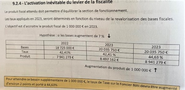 Attention,la présentation du maire est pour le moins étonnante il ne vous dit pas que il ne faut pas ajouter 7 % et 2 points d' augmentation des taux .Une personne peu au fait pourrait penser que l'augmentation du fait de la commune est de 2% confusion regrettable avec 2 points il vaut mieux dire la vérité