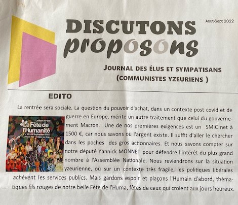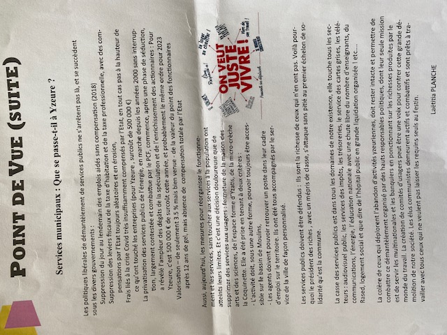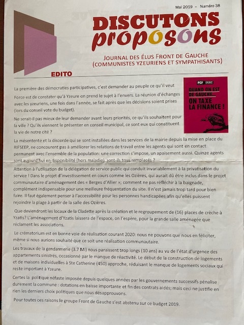 Le dernier numéro(voir à la fin de l’article) d’ un quatre pages est diffusé sur Yzeure par la branche néo- stalinienne de communistes d’ Yzeure signé par Madame Planche, chargée de ces attaques contre « les social traitres » ,connue à Yzeure pour être la chantre des « chaucidous » .Elle n’a d’ailleurs depuis qu’ elle est au Conseil municipal, réalisé le moindre mètre de chemins piétons ou cyclables à Yzeure .