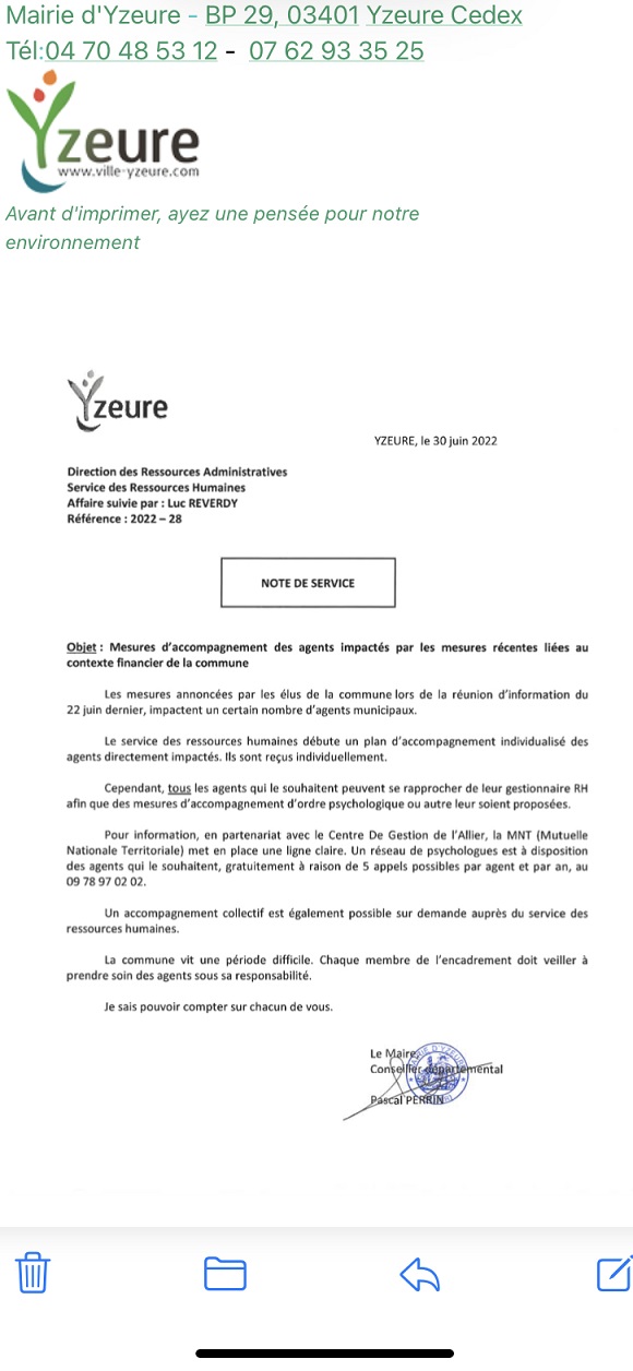 Cette note de service est un pur scandale car vous  vous  précipitez :les agents communaux n'ont pas  besoin de psychologues ils veulent garder leur travail .Les vrais socialistes et communistes qui restent  devraient quitter  ce vaisseau fantôme face à une telle attitude qui nécessiterait aussi un appel à un psychologue pour certains et pour le moins et il n'y pas que nous  qui le disons .Nous comprenons pourquoi vous avez recruté des agents au CHS à votre arrivée dans les conditions que l' on sait et puisque vous agissez ainsi nous les ferons connaître . Je rends publique cette note  inadmissible et vous informe que nous soumettrons plusieurs délibérations au contrôle de légalité de la préfecture .Si les grands  socialistes qui sont venus à Yzeure Mitterrand Bérégovoy ...et bien d'autres ne traverseraient plus la ville non parce que l'herbe envahit les trottoirs mais pour d'autres raisons .