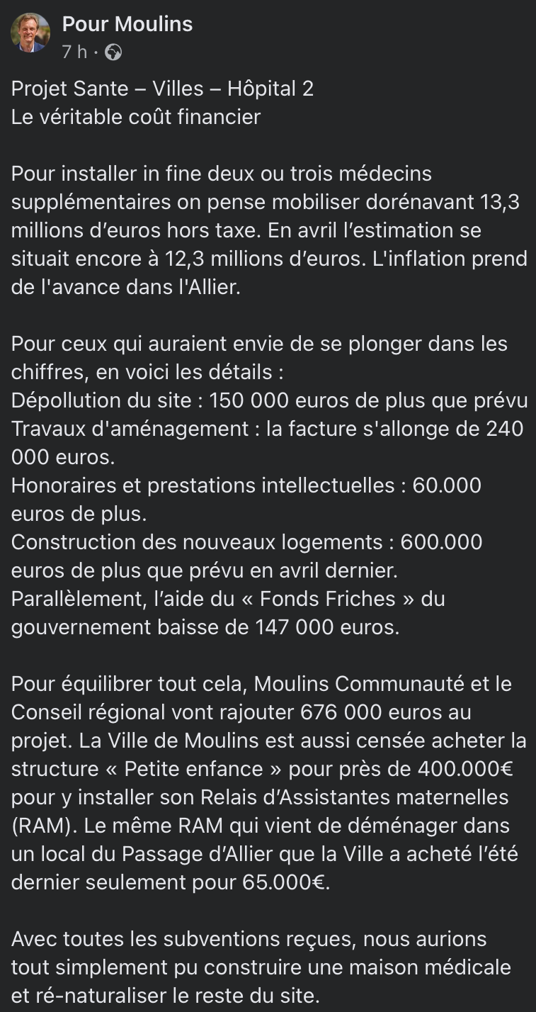 Le maire de Moulins a pensé à tort que cette attitude aurait des conséquences favorables sur le développement de la Ville .Non seulement ce n’est pas le cas mais les choix effectués dans les investissements, on s’en rend compte maintenant après plusieurs années , ont comme conséquences d’entrainer les autres communes dans le récession, récession parfois compensée en partie par une action municipale dynamique dans certaines (Avermes ..) ,amplifiée dans d’autres par des politiques récentes, mornes et frileuses (Yzeure …)