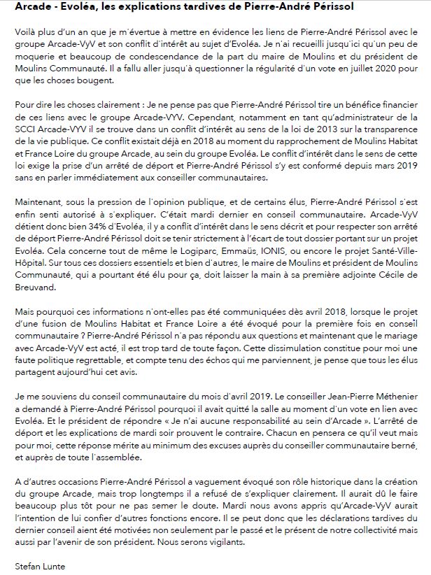 Depuis le Conseil Communautaire du 31 octobre 2020, il se confirme qu’il y a existence de conflit d’intérêt entre les intérêts publics et les intérêts privés de Pierre- André Périssol. Le vote du Conseil communautaire au 31 octobre 2020 sur les conditions d’implantation du IONIS Education Group a révélé aux Elus de Moulins Communauté l’existence d’un conflit entre des intérêts privés et personnel de Pierre-André Périssol en association avec le groupe Arcade-VYV (Arcade VYV détient 34% du capital d’Evoléa à travers France Loire) et l’intérêt public qu’il est sensé promouvoir en tant que président de Moulins Communauté. Pour cette raison il a été obligé de prendre un arrêté de déport impliquant qu’il doit se retirer et ne plus intervenir dans un dossier relatif à Evolea.