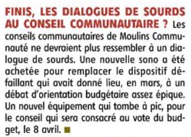 Nous avons compris  pourquoi les demandes de certains communes étaient absentes à la com d'agglo  . Le président n'entendait rien .La Montagne nous avoue que c'était un dialogue de sourds !Nous le disons depuis longtemps . Comment des sourds pouvaient réclamer à un président sourd à leur demande avec en plus une sono défaillante ? C'est sans doute pour cela que les séances étaient si longues ! C'était la quadrature du cercle !