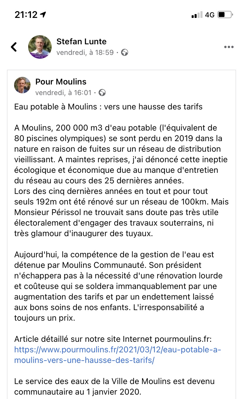 Nous vous avons alerté depuis plusieurs mois sur le dossier de l'eau ,nous vous joignons le texte publié par Stéphan Lunte sur la situation de l'eau à Moulins en ce début d'année 2021.