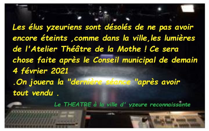 Il faut dire que la culture n'est peut être pas leur tasse de thé. Quant à l'adjoint à la culture son premier acte depuis son élection va sans doute être de cautionner la vente d'un équipement public, lieu de culture sans doute au profit d'une activité privée ? Il doit démissionner s'il vote pour ! En plus ils n'ont même pas réfléchi qu'ils risquaient de perdre le label de Scène régionale car il faut un lieu de création pour l'avoir. Ils risquent de perdre aussi la subvention liée à ce label.