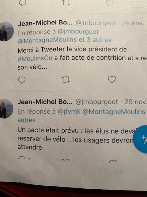 Quelle ne fut pas notre surprise en ce mercredi 9 septembre 2020 de voir, sur le coup de midi ,Jean Michel Bourgeot adjoint au maire d' Yzeure vice président de la Communauté d' Agglomération le moins bien élu accrocher son vélo sur la place J.Ferry et c'était un vélo électrique de Moulins communauté !!!!!!!!Le pacte était rompu .Pas de tweet pas de message à la Montagne pour annoncer la nouvelle