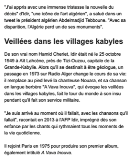 https://lyricstranslate.com/fr/vava-inouva-p%C3%A8re-inouba.htmlIdir, légende de la chanson kabyle, se plie à l’exercice du duo pour nous faire écouter un autre sens qu’il donne à ce partage pourtant si commun dans la musique. Le plus difficile n’est pas d’être invité à chanter avec autrui mais de se sentir admis comme un frère. Et non plus comme un étranger que l’on accueille avec bienveillance.