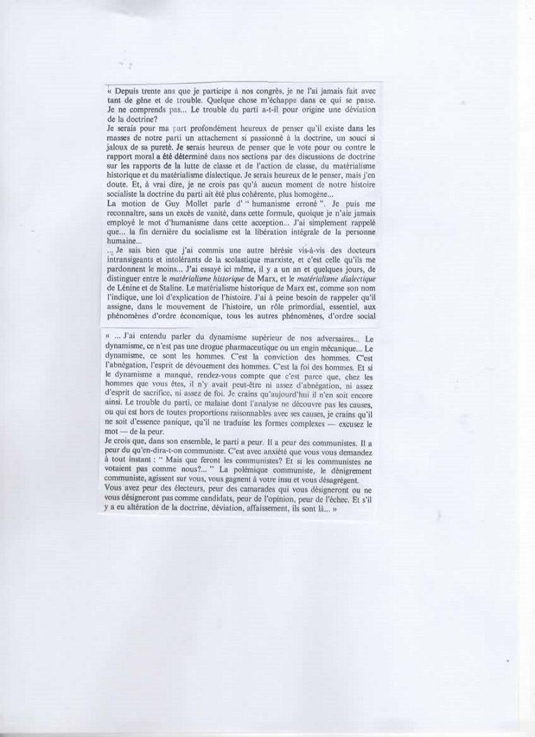 Discours prononcé par Léon Blum au Congrès de la SFIO qui vit Guy Mollet l'emporter sur Daniel Mayer. Peu de temps après cette soi-disant gauche du parti se rallia à la Droite et ce fut la fin de la SFIO.