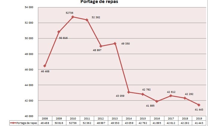 Portage des repas à domicile pour les personnes âgées : 43 059 en 2014 ; 41 443 en 2019 soit 1 616 repas de moins (3,9 % en moins).