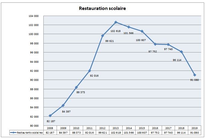 Restaurant scolaire : 101 566 repas en 2014, 91 080 en 2019 soit 10486 repas de moins (-10,3 %en moins) on ne vous le dit pas (maximum atteint en 2013 : 102 618)