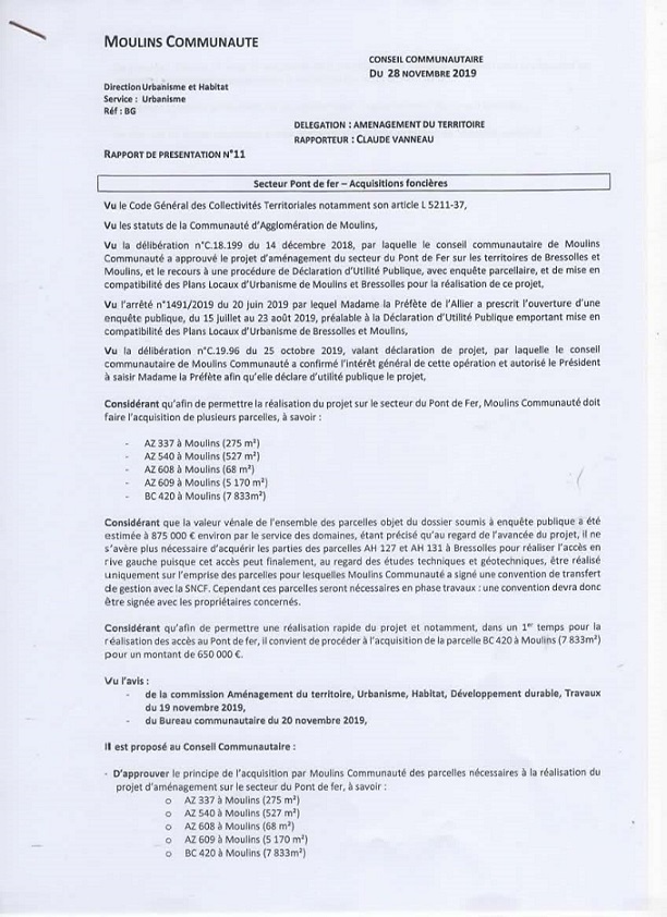 Et là, pour les anciens locaux de l'IUT, comme souvent, le Président dépose une délibération sur table, en dehors des délais réglementaires, ce qui, compte tenu du dossier risque d'entraîner une annulation s'il y a des recours. Les conseillers communautaires auraient du quitter la salle. Une commission économie convoquée une heure avant la séance, mais ou va-t-on ? La Com d'agglo de Moulins est-elle dispensée de respecter les lois de la République ?