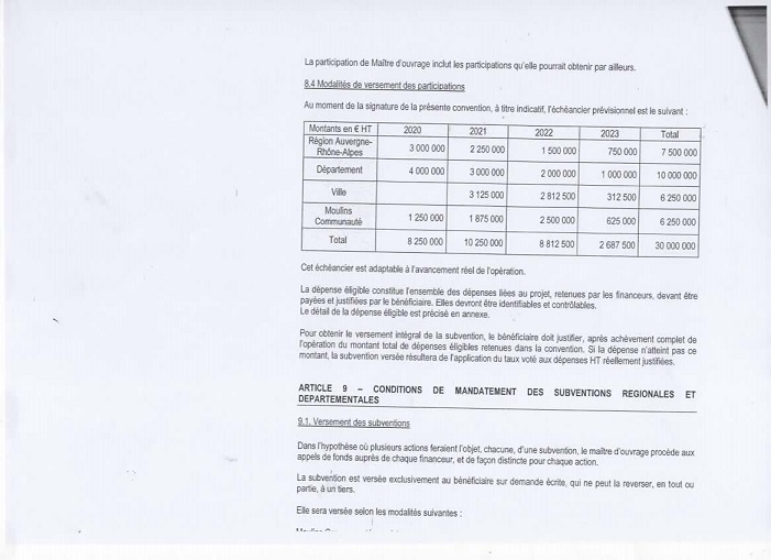 Regardez avec attention aucune participation n'est prévue de la part de la ville de Moulins en 2020 c'est la case blanche ! La ville de Moulins ne participera qu'en 2021. Pourquoi ? C'est ce que nous appellerons l'énigme du pont "sandébouché". Elémentaire mon cher Watson ! La ville de Moulins n'aura pas à inscrire un emprunt supplémentaire au budget primitif 2020 à quelques semaines des élections. Avis aux autres financeurs, la principale intéressée n'inscrit aucun financement en 2020. Le brave département de l'Allier va avoir à prévoir lui 4 000 000 d'euros à son budget ! Merci.