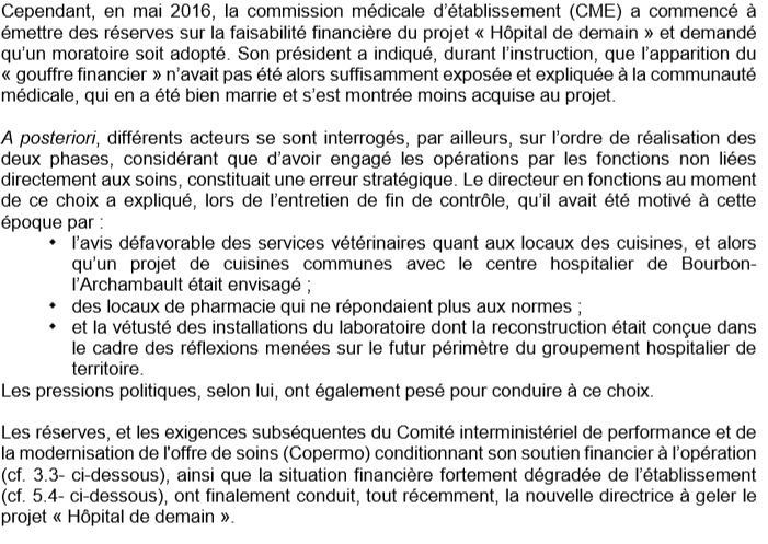 La Chambre des Comptes signale que les pressions politiques pourraient éventuellement avoir conduit à faire ces mauvais choix, cela n'intéresse pas beaucoup la presse locale qui n'est pas très curieuse. Tout cela a pu conduire à geler le projet "Hôpital de demain".