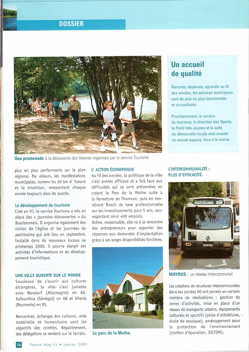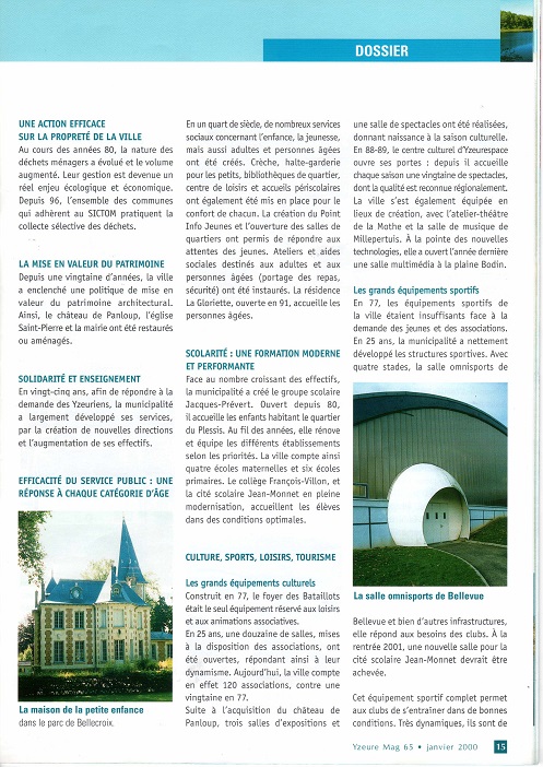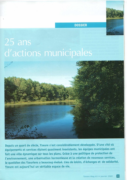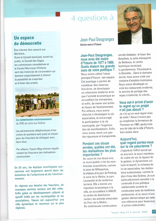 Yzeure en 2000 était devenue un véritable espace de vie grâce à une politique environnementale liée à une urbanisation harmonieuse suite à une forte acquisition foncière (357 hectares de terrains en 20 ans). Le dossier de janvier 2000 retrace l’évolution de la ville initiée par les équipes municipales successives et les associations. Jean Paul Desgranges maire de 1977 à 1989 décline à travers les colonnes de ce numéro qui lui sont ouvertes les réalisations importantes. En complément des acquisitions foncières telles la zone de millepertuis, le parc Laussedat, le volet économique (implantations de la MACIF, du centre de distribution Leclerc et création de la zone artisanale du parc de la Mothe) s’est fortement développé. Le foyer des Bataillots, la gendarmerie, la Gloriette ouverte en 1991, Yzeurespace, la salle de sports de Bellevue ont au fil des ans complété les équipements de la ville jusqu’à ce jour. En se souvenant des belles choses tout en n’oubliant pas les échecs, l’homme politique responsable qu’il est, souligne son regret de n’avoir pu malgré trois ans de lutte, s’opposer à la fermeture de l’usine Thomson. Enfin son regard sur l’avenir est particulièrement positif car il apprécie l’effort social qui se poursuit ainsi que les réalisations audacieuses comme le plan d’eau des Ozières et se dit particulièrement sensible à la politique relationnelle ouverte et au souci d’une gestion démocratique de la ville.